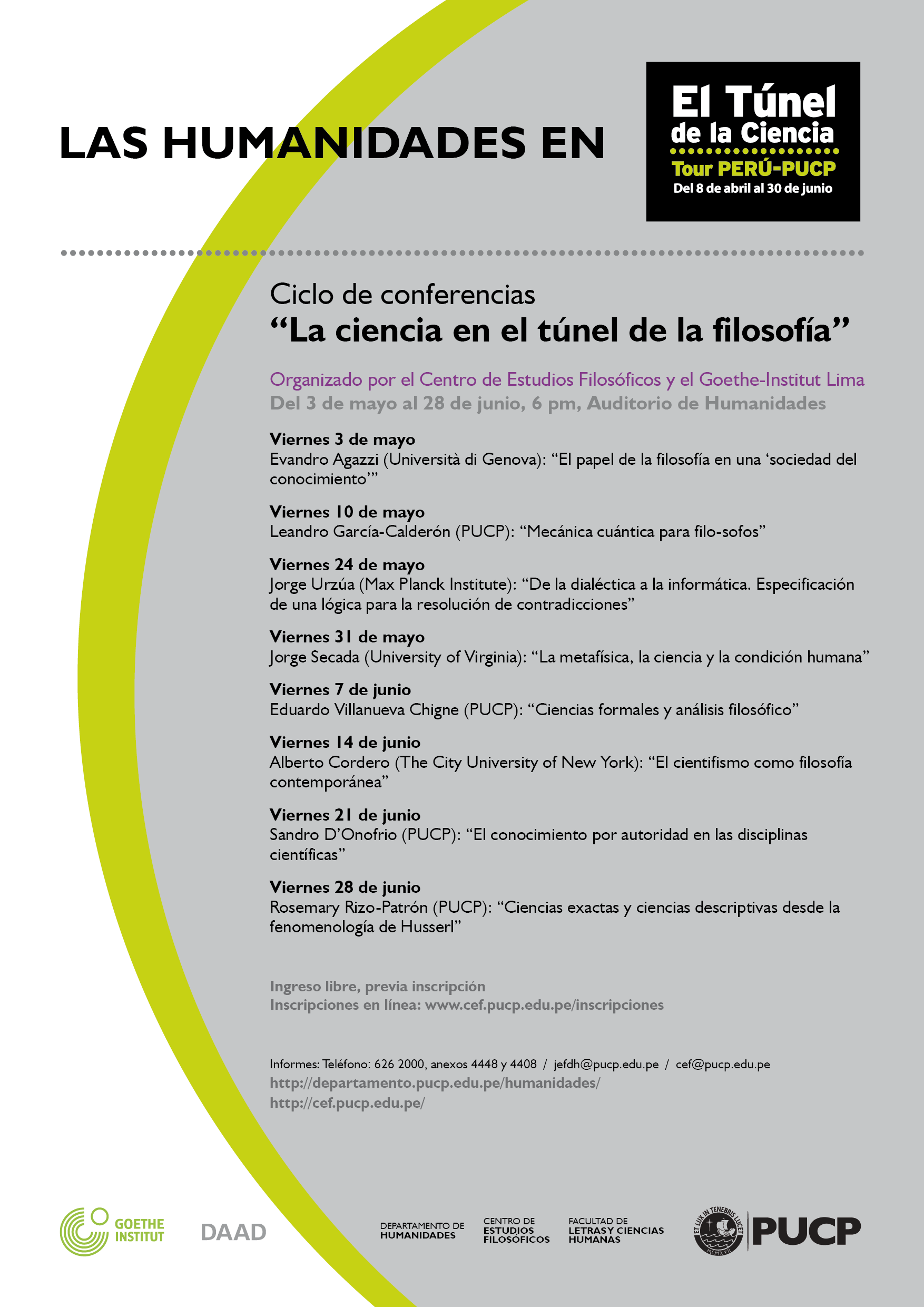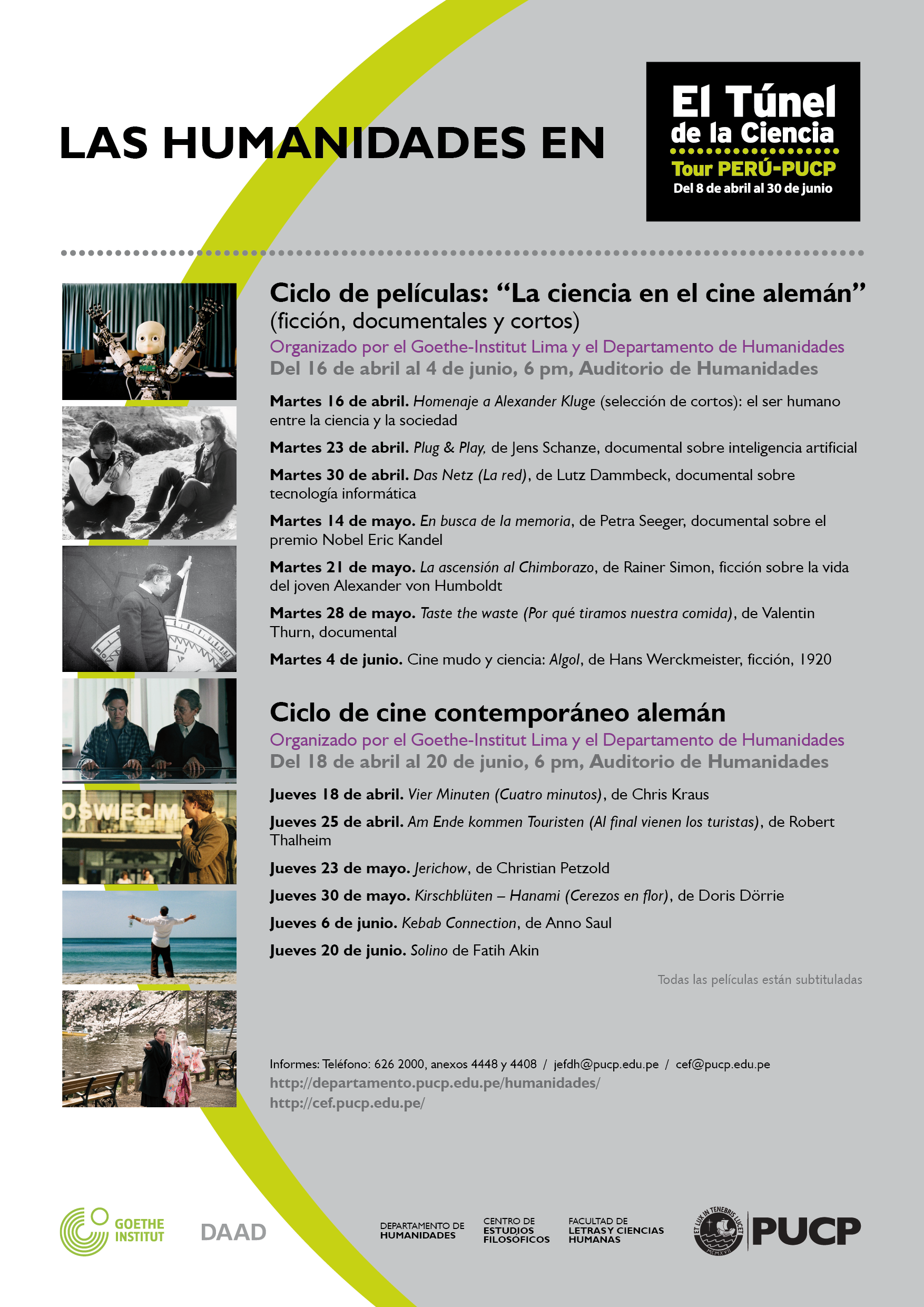 En el marco de las actividades relacionadas a la muestra “El Túnel de la Ciencia” (http://tuneldelaciencia.pucp.edu.pe/), el Goethe-Institut Lima, el Departamento de Humanidades y el Centro de Estudios Filosóficos de la PUCP ofrecen un programa cultural muy especial. Entre el 16 abril y el 28 junio, siempre en el Campus de la Pontificia Universidad Católica del Perú, se podrá disfrutar de películas de ficción, documentales, música y conferencias de alto nivel. El ingreso a todas las actividades de este programa cultural es libre.