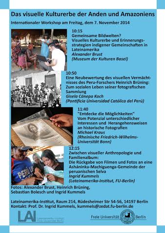 La doctora Gisela Cánepa Koch participó en un taller sobre cultura visual (“Das visuelle Kulturerbe der Anden und Amazoniens”) que se celebró el 07 de noviembre del 2014 en el Instituto de Estudios Latinoamericanos de Berlín. En este presentó la investigación “Eine Neubewertung des visuellen Vermächtnisses des Peru-Forschers Heinrich Brüning: zum sozialen Leben seiner fotografischen Sammlung”, la cual surge del trabajo que empezó en los archivos del Instituto Iberoamericano y del museo etnológico de Berlín sobre las fotografías de Heinrich Brüning.