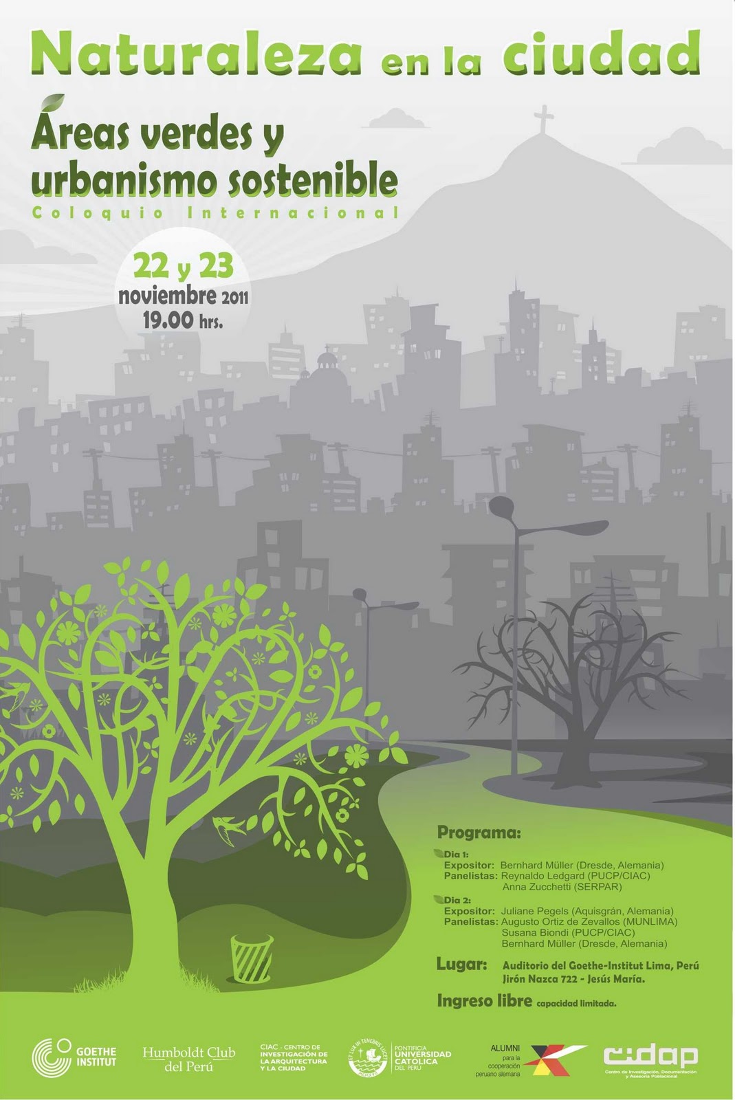 El Humboldt Club del Perú en cooperación con el Goethe-Institut, la Asociación Alumni para la Cooperación Peruano Alemana, el Centro de Investigación de la Arquitectura y la Ciudad (PUCP/CIAC) y el Centro de Investigación, Documentación y Asesoría Poblacional (CIDAP), llevó a cabo el Coloquio Internacional “Naturaleza en la ciudad. Áreas verdes y urbanismo sostenible”. El evento se realizó el martes 22 y el miércoles 23 de noviembre del 2011, en el auditorio del Goethe-Institut de Lima.